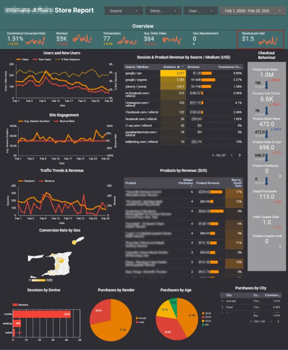 Finally to track your data, you need to be able to visualise it. I set up a shared Google Data Studio sheet for my client so we can track user purchase paths and conversions. We also track the best sellers as well as where most of her sales are coming from. You can see a sample of the data below.